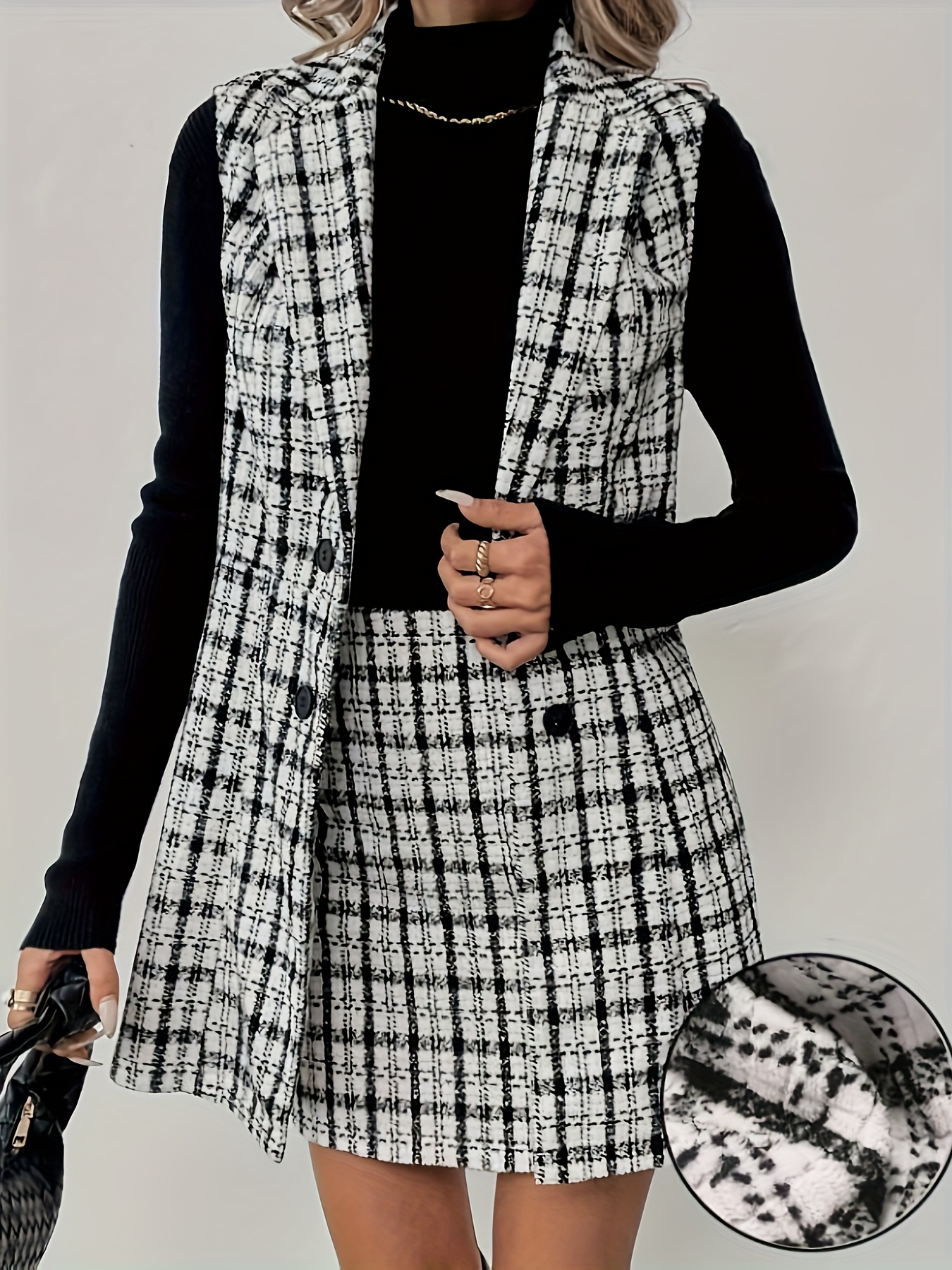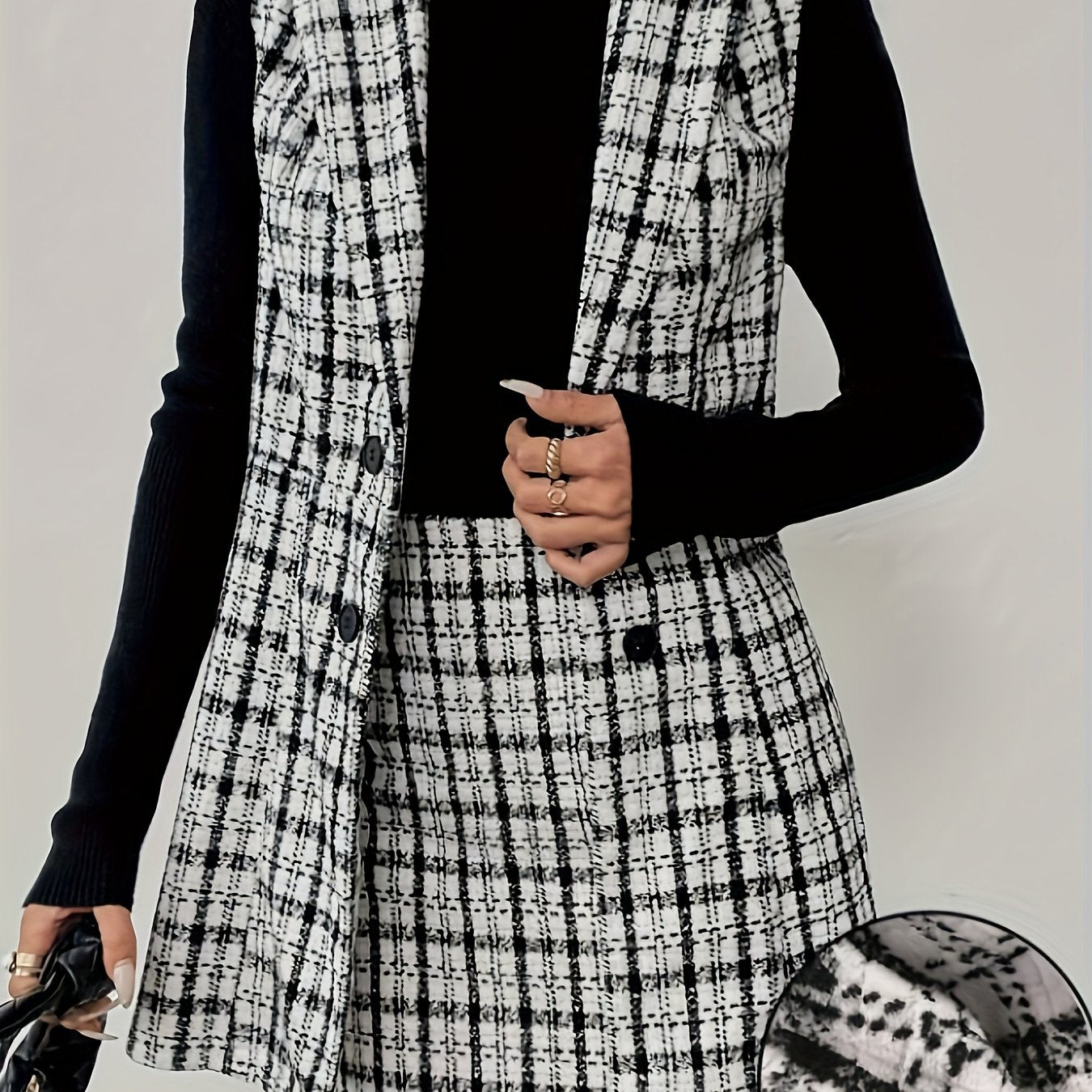 Ensemble motif carreau blanc et noir deux pièces blazer sans manches et d'une jupe courte, parfait pour une tenue professionnelle élégante.